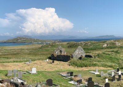 A grave was opened at the beginning of July in the new part of the cemetery, the risk of disturbing burials in the older part being too great. To the accompaniment of keener Caitríona Ní Cheannabháin and musician Eoin Mac Casarlaigh, the islanders lowered the coffin, covered it with straw and filled the grave with soil, placing a layer of sea-rounded white stones on top. A memorial stone was laid on top. It stated “May they rest in peace forever more.”