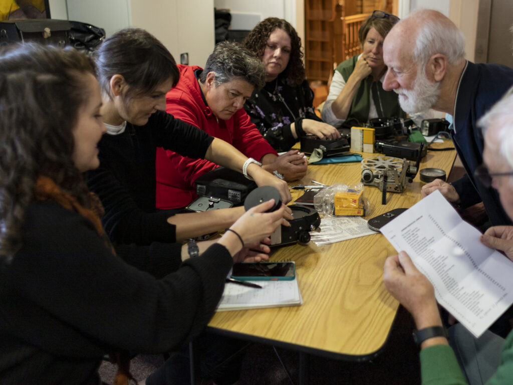 Michael Mulcahy (right) guides Carolann Madden, Sarah Arnold, Rena Blake, Lorraine Neeson and Lisa Fingleton through the working of a Bolex 16mm camera during Heritage Week 2024.