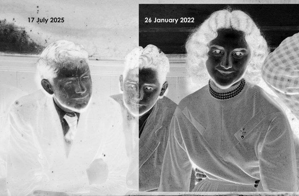 Preliminary conservation work revealed the extent of damage concealed in drawers that had not yet been scanned. The relentless progress of vinegar syndrome can be seen in the deterioration in negatives Kathy and Steve scanned three years before (see below). However, even the most damaged strips contain striking images that can be scanned and our priority now is to save these images. It’s a race against time.